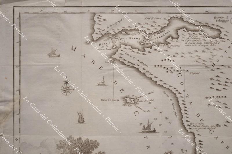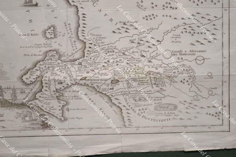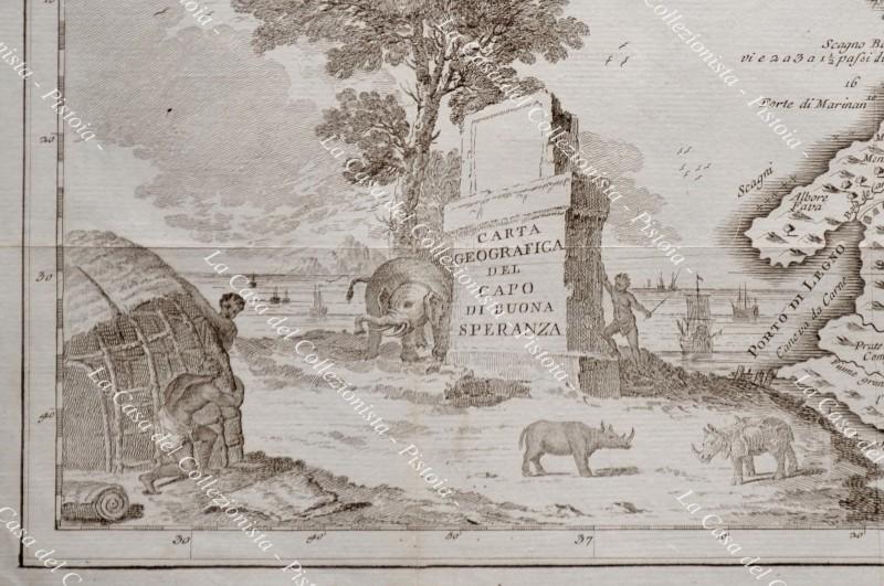SUD AFRICA. Carta geografica origianale. "CARTA GEOGRAFICA DEL CAPO DI BUONA SPERANZA". Venezia, Salmon circa 1750. Mm 425x330 (ai margini 495x370). Più volte ripiegata (proviene d alibro), qualche strappetto marginale di cui uno interessa la cornice. (Rif.D9355)