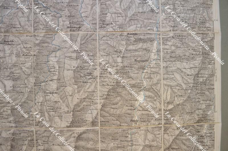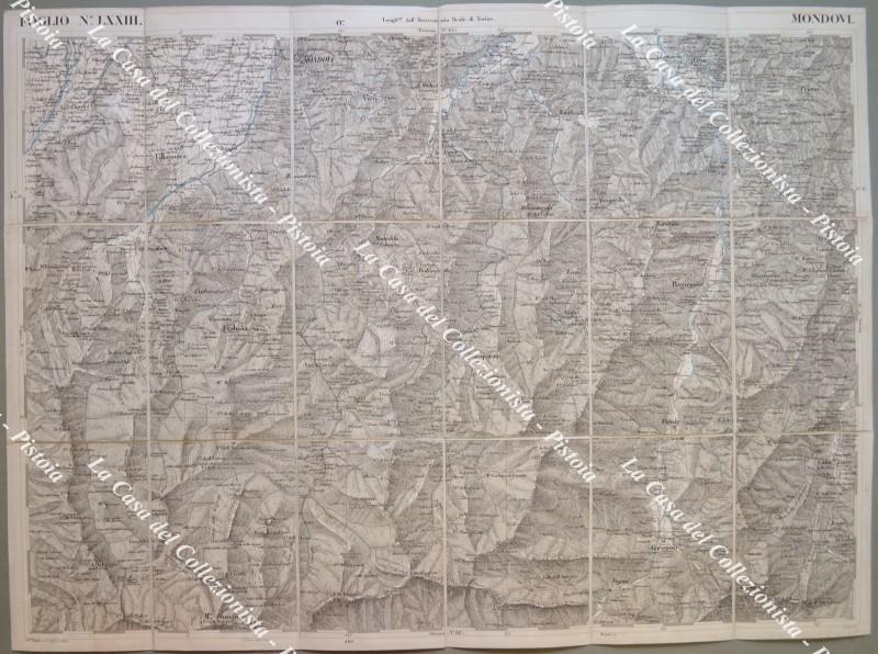 PIEMONTE. MONDOVI’, foglio n. LXXIII. Circa anno 1855. Carta geografica alla scala di 1:50.000 realizzata dal Corpo di Stato Maggiore ed edita a Torino da Giovanni Maggi. Ripiegata e montata all’epoca su tela, fiumi e laghi colorati in azzurro e misura ai margini cm 74x55. Ripiegata in quattro. (Rif.F6358)