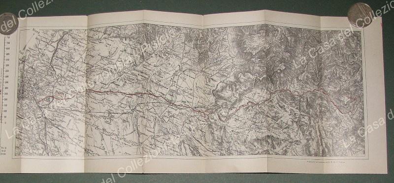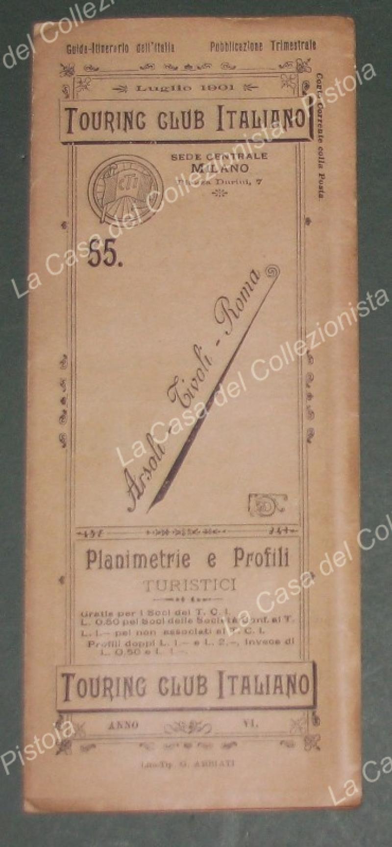 ARSOLI-TIVOLI-ROMA. Planimetria e profilo ciclistico. Anno 1901. Graziosa cartina edita dal Touring Club Ciclistico Italiano contenuta in brossura editoriale e piegata a fisarmonica. MM 940x210. Nella prima parte l'altimetria del percorso con note sulla pendenza e lo stato delle strade; nella seconda parte la certina topografica della zona. Aperta la cartina misura cm 98,5x21,5. (Rif.E4217)