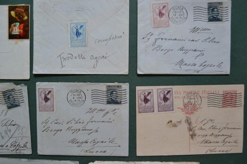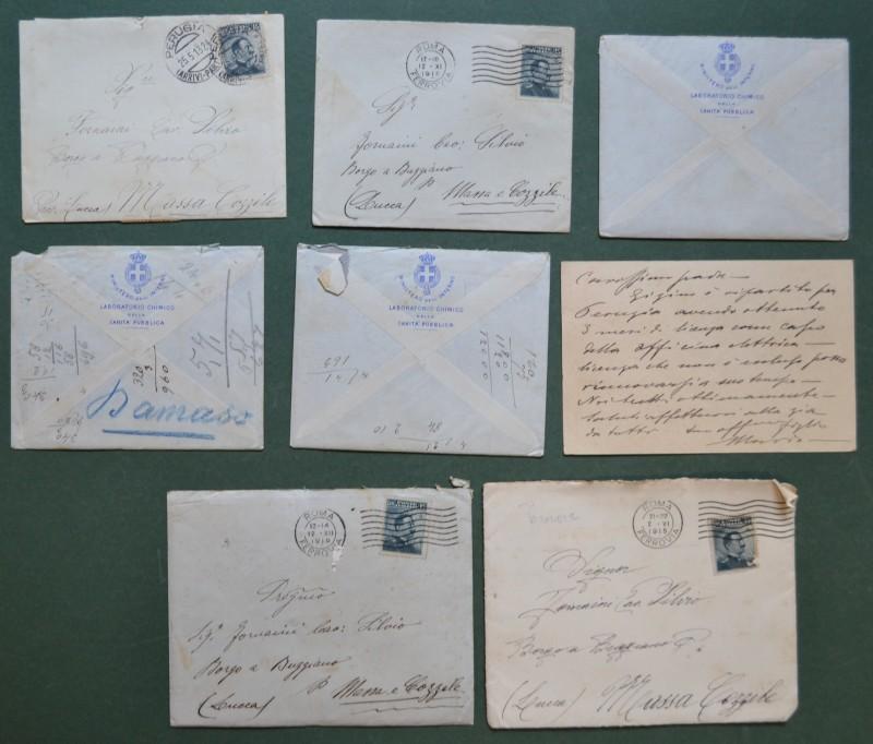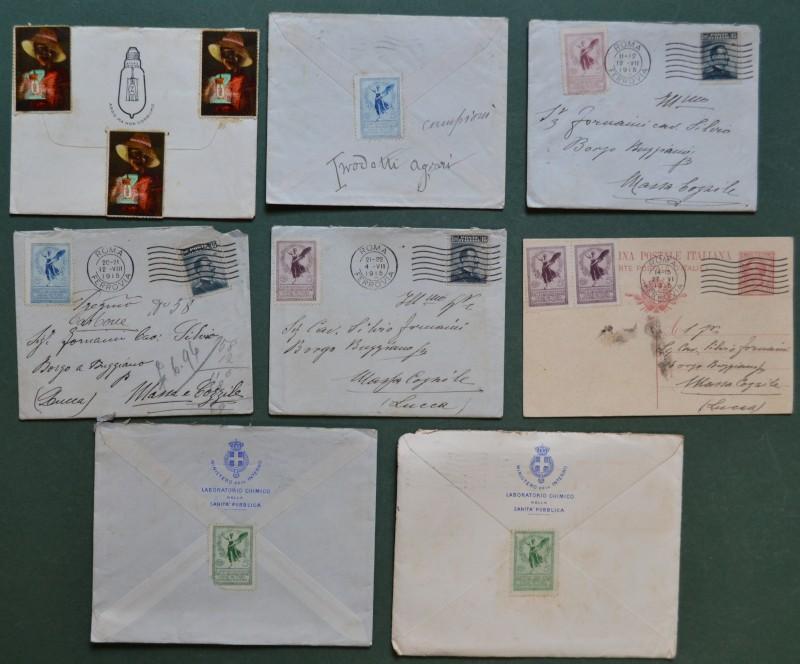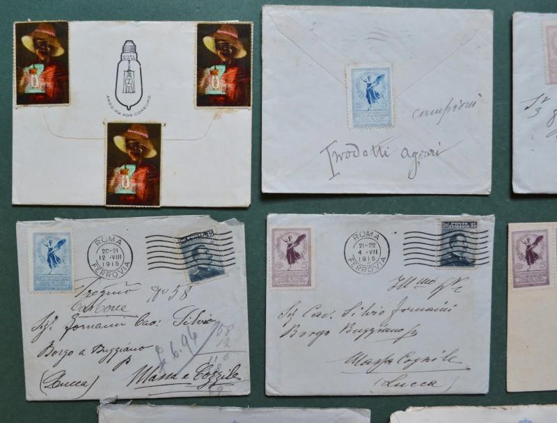 ERINNOFILIA. 6 lettere e 1 cartolina postale viaggiate tra il 1913 ed il 1915. Sei (colori diversi) del Comitato Romano Organizzazione Civile; una con tre chiudilettera pubblicitari di una lampada economica. Conservata la corrispondenza. (Rif.F7012)