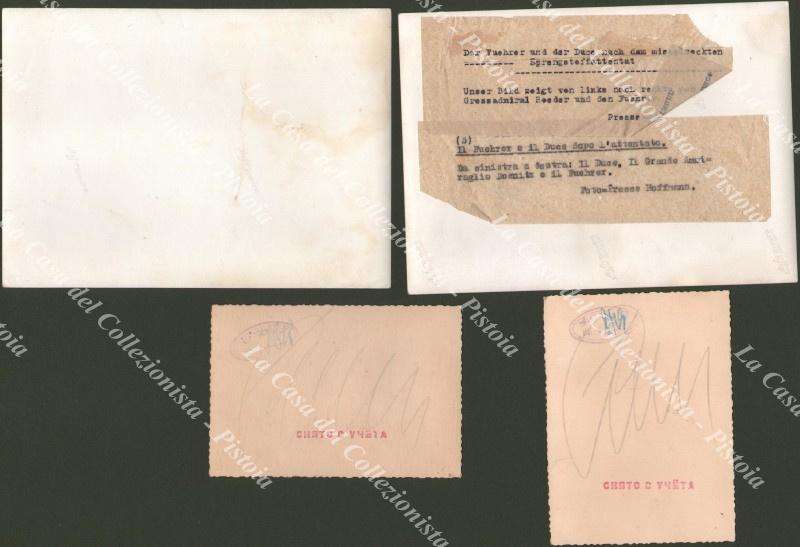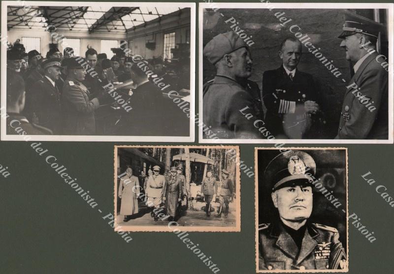 FASCISMO - NAZISMO. 4 fotografie originali databili attorno al 1940: 1) Foto di cm 18x13. Mostra Mussolini in visita ad un opificio. 2) Foto di cm 18x13. Mostra in primo piano Mussolini, Hitler e l’ammiraglio Doenitz. A retro didascalia bilingue applicata. 3) Foto di cm 11.5x8. Mostra in primo pianoMussolini, Hitler e Goering. A retro didascalia stampata in caratteri cirillici. 4) Foto di cm 8x11.5. Mostra a mezzo busto Mussolini in divisa. A retro didascalia stampata in caratteri cirillici. Conservazione ottima. (Rif.F1874-56/75)