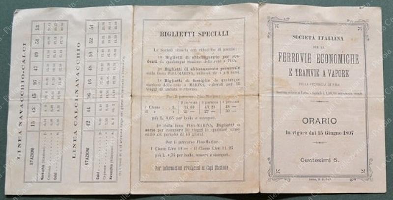 FERROVIE ECONOMICHE E TRAMVIE A VAPORE della provincia di Pisa. Orario del Giugno 1897. Pieghevole di cm 9x13 (aperto cm 13x26. Piccole usure. (Rif.F6827)