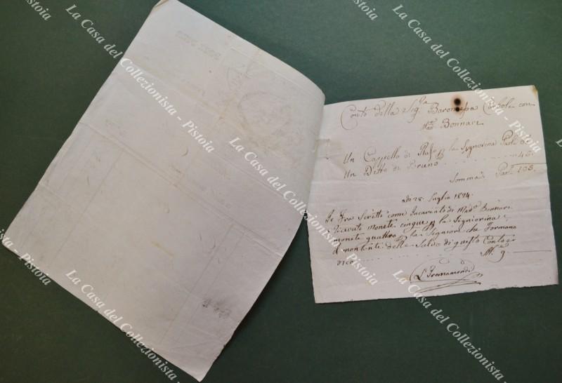 Firenze, via dei Balestrieri, anno 1825. Magasin de Soieries. Petit Courrier des Dames. Conto (di cm 21x26, con annessa quietanza) per l'acquisto due cappelli. Bella vignetta incisa all'acquaforte di cm 10x5,5. (Rif.F7050)