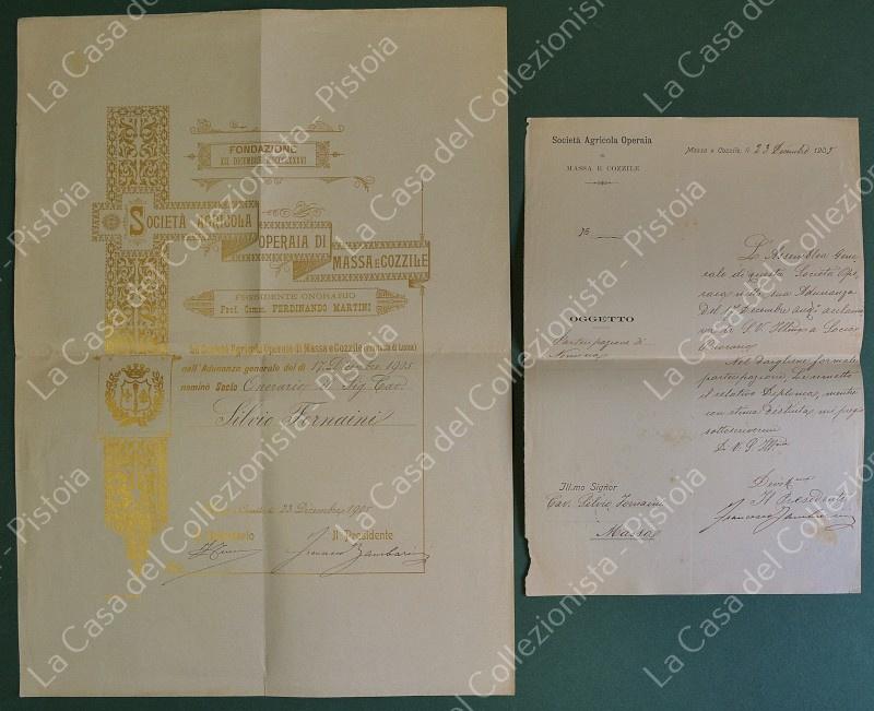 MASSA e COZZILE, Pistoia. SOCIETA' OPERAIA. Diploma con nomina di socio del 1905, stampata in oro, cm 31x42. Unita lettera di partecipazione. Buona conservazione eccetto due strappetti laterali. (Rif.F7789)