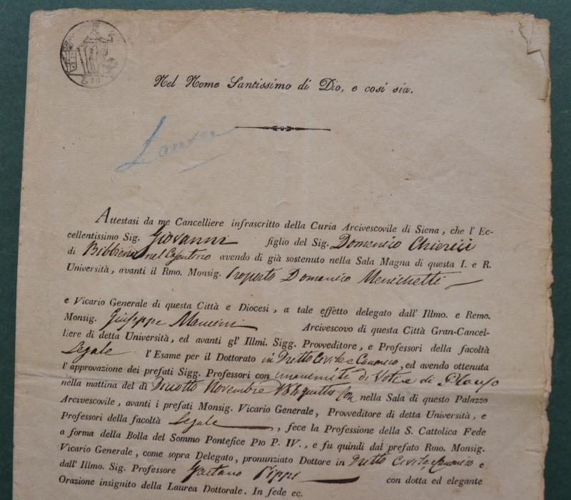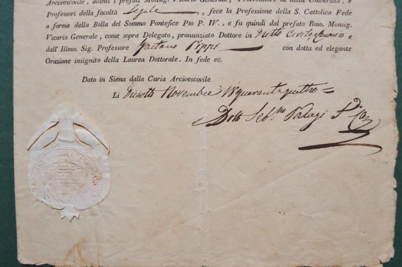 Siena, anno 1844. LAUREA IN DIRITTO CIVILE E CANONICO. Attestato (firma e sigillo cartaceo) di cm 20x30 rilascaito dalla Curia Arcivescovile di Siena(in base alla bolla di Papa Pio IV per ottenere la laurea in legge occorreva fare professione di fede cattolica). Ottima conservazione. (Rif.F7605)