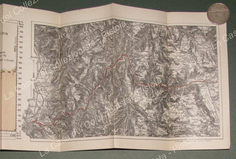 SPOLETO-FORCA DI CERRO-NORCIA. Planimetria e profilo ciclistico. Anno 1901. Graziosa cartina edita dal Touring Club Ciclistico Italiano contenuta in brossura editoriale e piegata a fisarmonica. MM 940x210. Nella prima parte l'altimetria del percorso con note sulla pendenza e lo stato delle strade; nella seconda parte la certina topografica della zona. Aperta la cartina misura cm 72x21,5. (Rif.E4219)