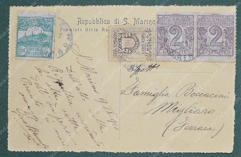 SAN MARINO. Coppia centesimi 2 violetto (Sassone n. 34) + centesimi 5 verde (Sassone n. 35) + centesimi 1 (Sassone n. 47) su cartolina del 1910 per Migliano. In tariffa. Buona qualità. (Rif.F6974)
