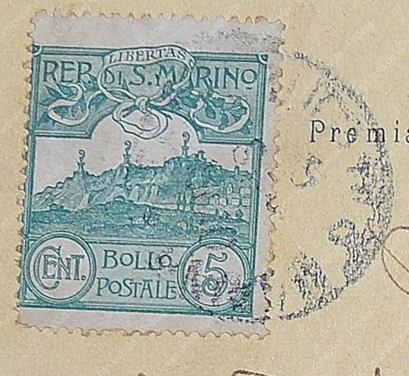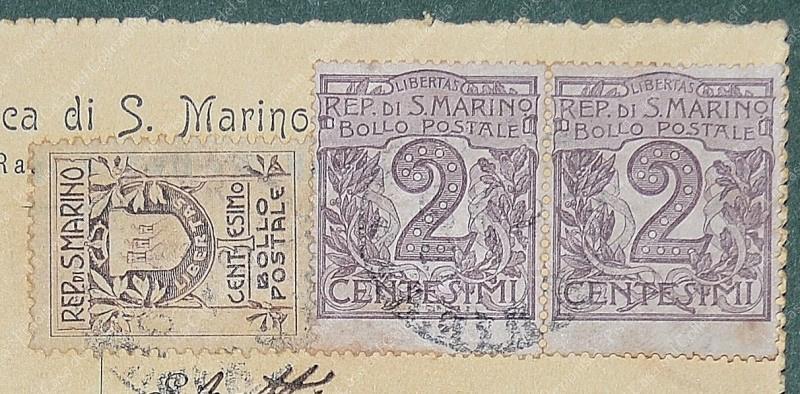 SAN MARINO. Coppia cent. 2 violetto + cent. 5 verde + cent. 1 su cartolina del 1910