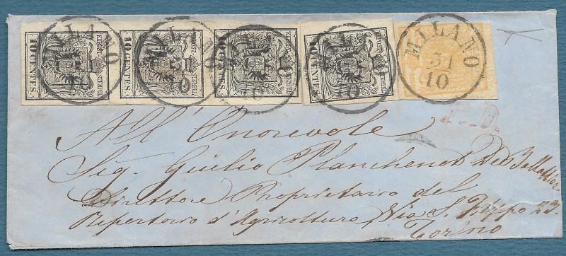LOMBARDO VENETO 1850 (I emissione). 5 centesimi giallo ocra carta a mano + 10 centesimi nero, striscia verticale di tre ed esemplare singolo, stampati su carta a macchina (Sassone numeri 1 + 19) annullati con quattro impronte del timbro datario a cerchio semplice di Milano (accompagnate sul frontespizio dal "PD" rosso di controllo) su busta per Torino del 31 ottobre 1858 (ultimo giorno di validità). Perfetta e molto fresca. Conservata la corrispondenza. Certificato Giacomo Bottacchi. (Rif.F7762)