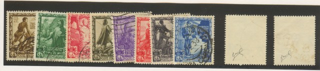 Regno. Anno 1938. Proclamazione dell'Impero. Sassone serie 93 (nn. 439 - 448). I dieci valori usati. Il 2,75 e il 5 firmati Biondi. Ottima qualità. (Rif.B6495)