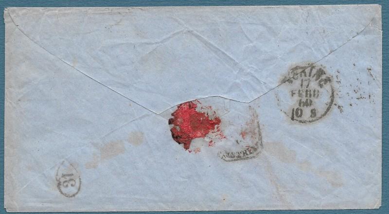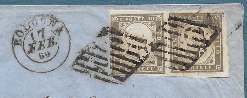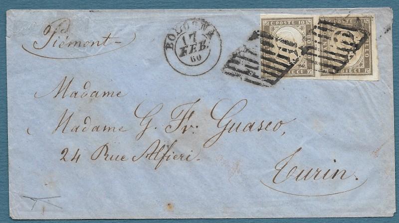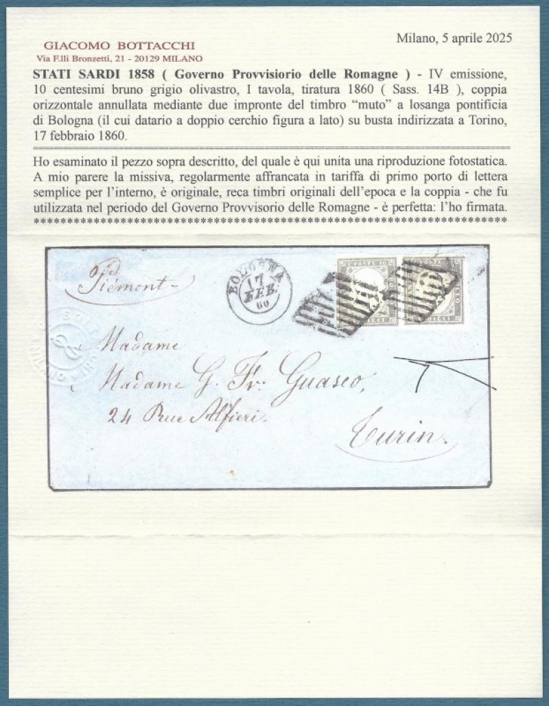 STATI SARDI. GOVERNO PROVVISORIO DELLE ROMAGNE. IV emissione, 10 centesimi bruno grigio olivastro, I tavola, tiratura 1860 ( Sassone 14B), coppia orizzontale annullata mediante due impronte del timbro "muto" a losanga pontificio di Bologna (datario doppio cerchio a lato) su busta indirizzata a Torino del 17 febbraio 1860. Conservata la corrispondenza. Ottima qualità, certificato Bottacchi. (Rif.F7763)