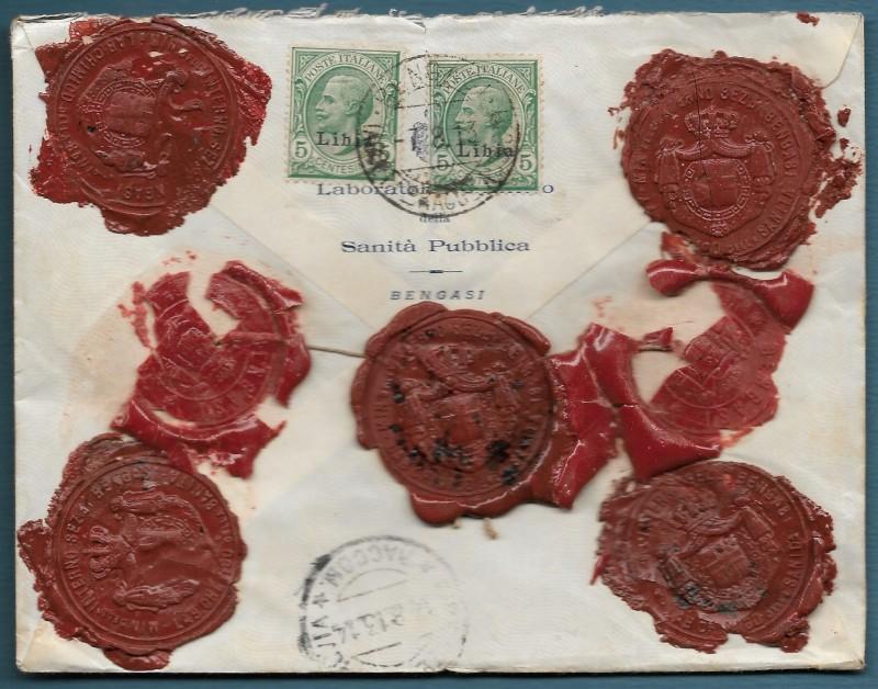 Colonie. LIBIA. Assicurata per lire cento del 7.8.1913 da Bengasi a Massa Cozzile. Affrancata con 3 pezzi cent. 5 Leoni e 2 pezzi cent. 25 Michetti soprastampati.