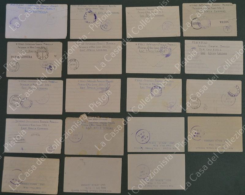 SECONDA GUERRA. PRIGIONIERO DI GUERRA ITALIANO IN AFRICA ORIENTALE. Unica corrispondenza. 19 lettere per Roma tra il 13 aprile 1942 ed il 15 marzo 1945. Complete del testo. Bolli vari di posta e censure. Conservazione ottima. (Rif.F7822)