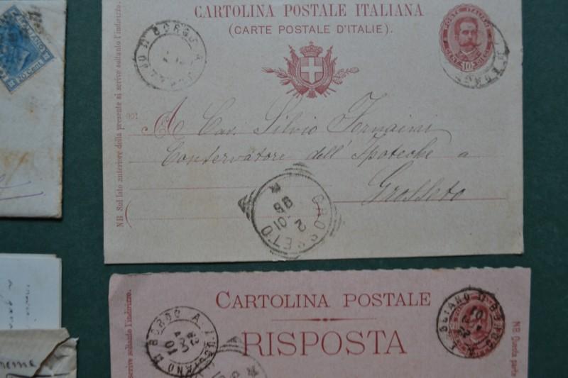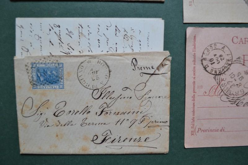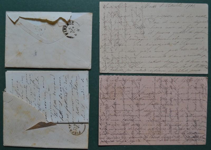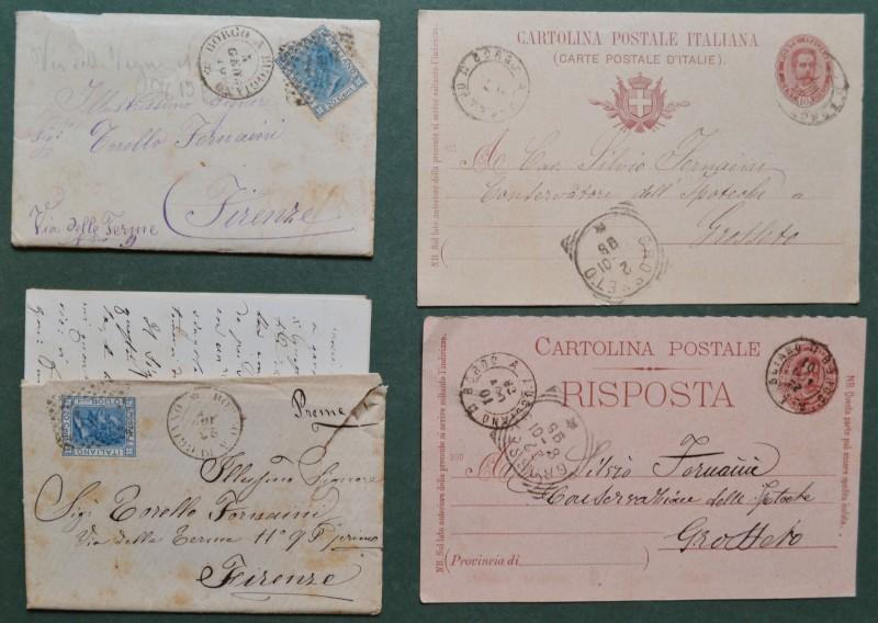 BORGO A BUGGIANO. Bollo nero sardo italiano. 2 bustine (con corrispondenza) e 2 cartoline postali. Periodo 1875 - 1901. (Rif.F7011)