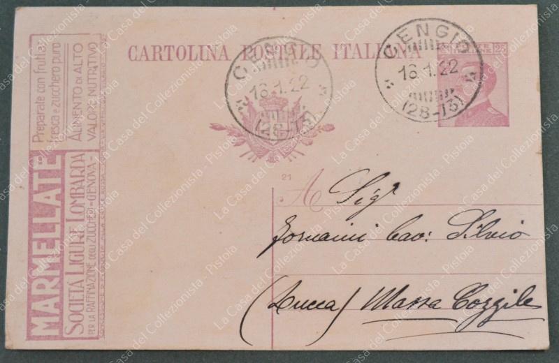 St. postale Regno. MARMELLATE SOC. LIGURE LOMBARDA. Cartolina postale da cent. 25 tipo Michetti con tassello pubblicitario; viaggiata nel 1922. (Rif.F6859)