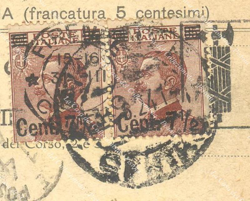 Storia postale ITALIA REGNO. Coppia centesimi 7 e mezzo su cent.85 bruno rosso (Sassone n.135) su cartolina postale commerciale del 30 Marzo 1924. Francobolli ben dentellati. (Rif.D6933)