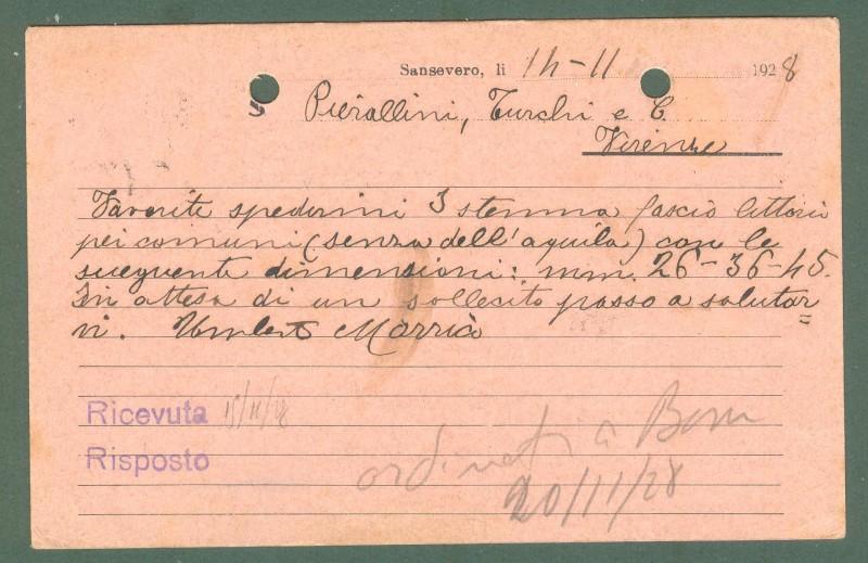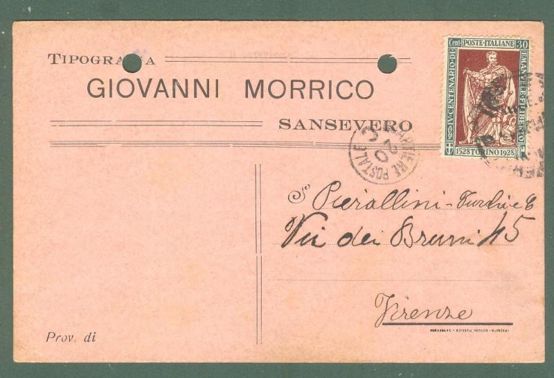 Storia postale. REGNO. Emanuele Filiberto cent. 30 dentellato 13 3/4 su cartolina del 1928. Sassone n. 232. Ottima qualità. (Rif.D4742)