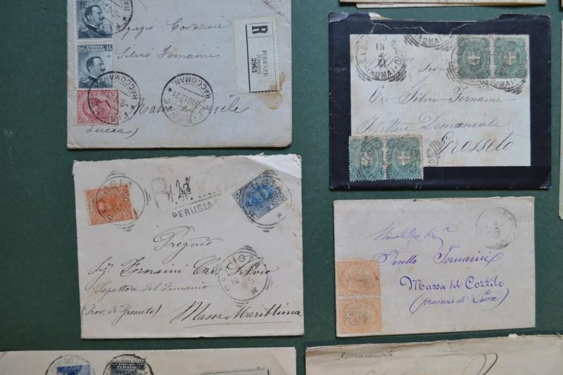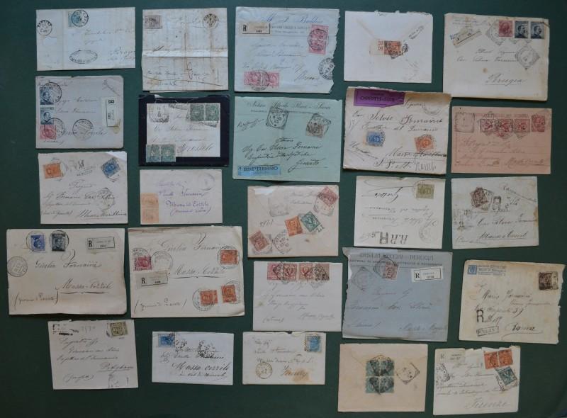 Storia Postale, Regno. Insieme composto da 22 tra lettere, raccomandate ed espressi (unica corrispondenza), una lettera del 1852 da Bologna a Firenze ed una parte di lettera del 1854 da Venezia a Perugia. In tutto 24 pezzi,. (Rif.F7007)