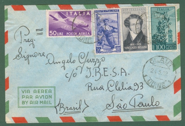 REPUBBLICA * AEREOGRAMMA - 24.03.1952 da Claut (Udine) a San Paolo in Brasile. Affrancato con lire 20 Italia Lavoro + lire 20 Bellini + lire 50 Posta Aerea Democratica + lire 100 Posta Aerea Campidoglio. Francobolli ben dentellati, qualità ottima. (Rif.C5357)