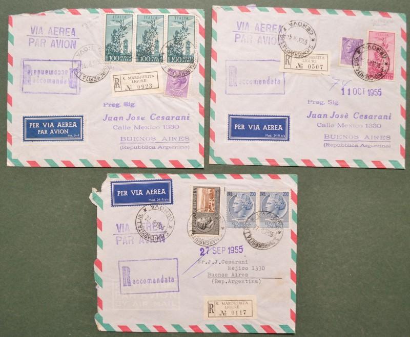 Storia postale Repubblica. 3 RACCOMANDATE AEREE per l'Argentina del 1955/56. I valori da 100 e 300 hanno filigrana ruota.