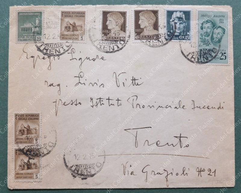 St. postale REPUBBLICA SOCIALE ITALIANA. Lettera del 12.2.1945 da Cavalese a Trento. Affrancata con cent. 25 F.lli Bandiera + 2 pezzi cent. 10 Imperiale + cent.15 Imperiale + cent. 25 Monumento distrutti + 3 pezzi cent. 5 Monumenti distrutti. In tariffa. Francobolli ben dentellati, una leggera piega verticale è presente sulla busta ma non interessa i francobolli. (Rif.F6906)