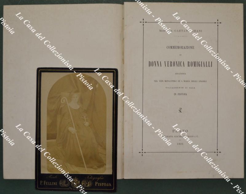 Fotografia Post Mortem. VERONICA ROMIGIALLI (Pistoia 1824 - Pistoia 1891). Insieme composto da: 1) Rara fotofrafia post mortem dello Studio Fellini di Pistoia; albumina di mm 95x135 su cartoncino dello studio. 2) Beani Gaetano. Commemorazione di Donna Veronica Romigialli; abbadessa nel Ven. Monastero di S. Maria degli Angeli volgarmente di Sala in Pistoia. Prato, Giachetti, 1891. Cm 16x23.5, brossura editoriale, pp. 24. La prima parte contiene la biografia, la seconda la storia delle monache benedettine in Pistoia a partire dal 1322. Buona conservazione. (Rif.F7240)