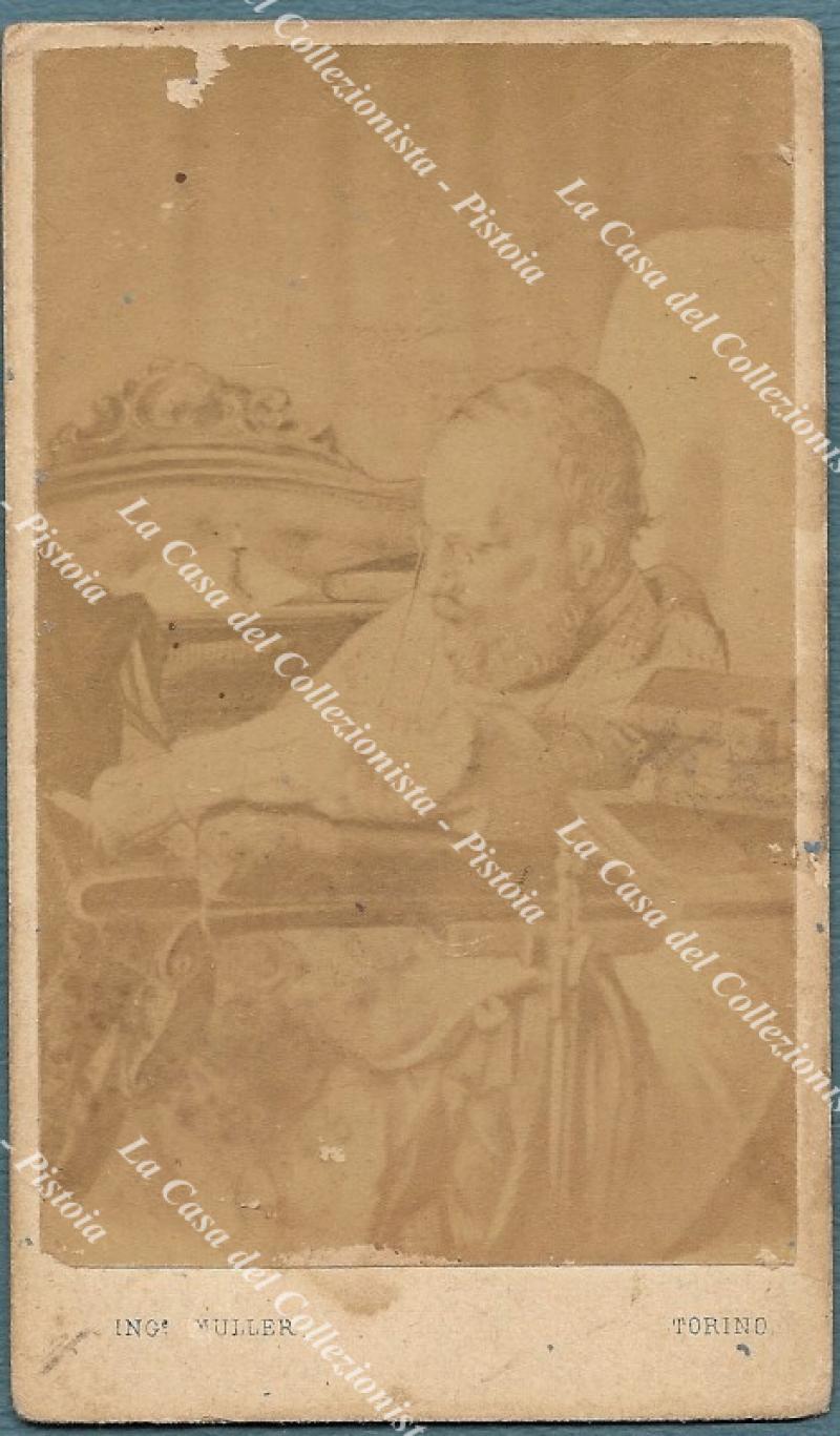 GARIBALDI GIUSEPPE raffigurato seduto su una poltrona. Foto all’albumina su cartoncino di Muller a Torino.