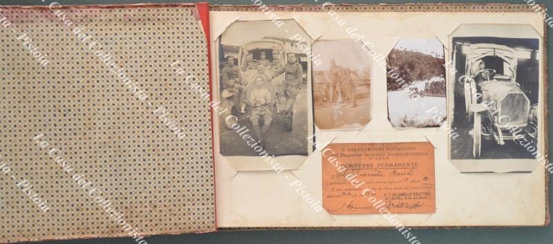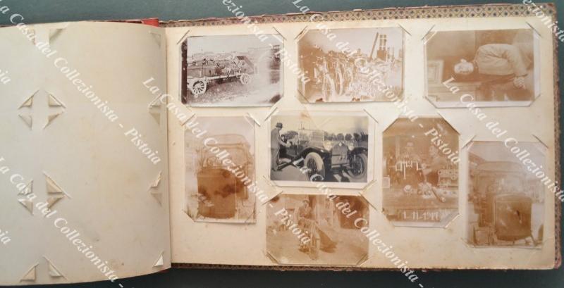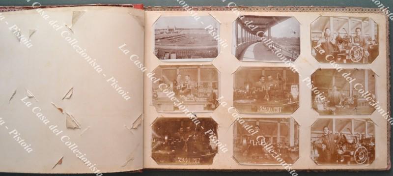 LO STADIUM di TORINO. Nel 1909 nel luogo ove era la Piazza d’Armi fu costruito un imponente complesso sportivo polivalente denominato “Stadium” capace di 70.00 spettatori. ALBUM di cm 33x21 con i piatti in cartone contenente, uniti da un cordino, 4 fogli con applicate 29 foto per lo più di cm 8,5x6 ed un permesso permanente del I° Stabilimento Distaccato del Deposito Centrale Automobilistico presso lo Stadium. Mostrano interni d’officina, primi piani di soldati e vedute parziali del complesso. L’insieme è databile tra il 1917 e l’inizio del 1918. Ottima conservaz. eccetto usure ai piatti in cartone. Insieme raro. (Rif.F0618-74)