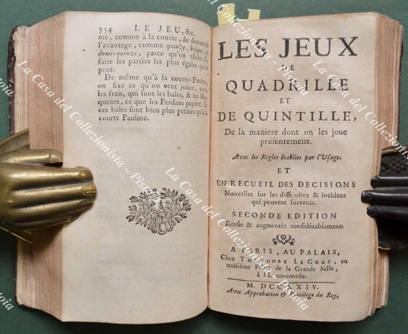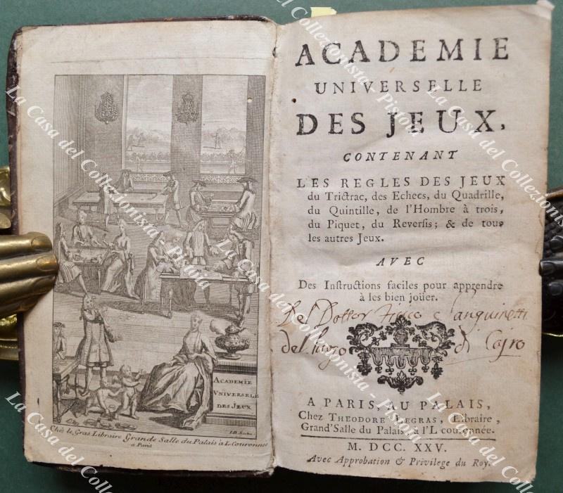 (Giochi ediz. '700) ACADEMIE UNIVERSELLE DES JEUX. Contenant les regles des jeux du Trictrac, des Echecs, du Quadrille, du Quintille, de l'Hombrea trois, du Piquet, du Reversis; & de tout des àutres jeux. AVEC Des Instructions faciles pour apprendre a les bien jouer. Paris, Chez Theodore Legras, 1725. Cm 9,2x16,3, legatura coeva in prima pelle con al dorso nervi e fregi e titolo in oro. Frontespizio inciso, seguono pagine 6 non numerate, pagine 354, pagine 170, pagine 4 non numerate, pagine 52, pagine 6 non numerate. Restauri professionali al dorso e punte; interno buono eccetto forellino di tarlo al margine interno di gran parte delle pagine; vecchia scrittad'eppartenenza al frontespizio e aloncino al margine superiore delle prime 90 pagine. (Rif.F7825-77)