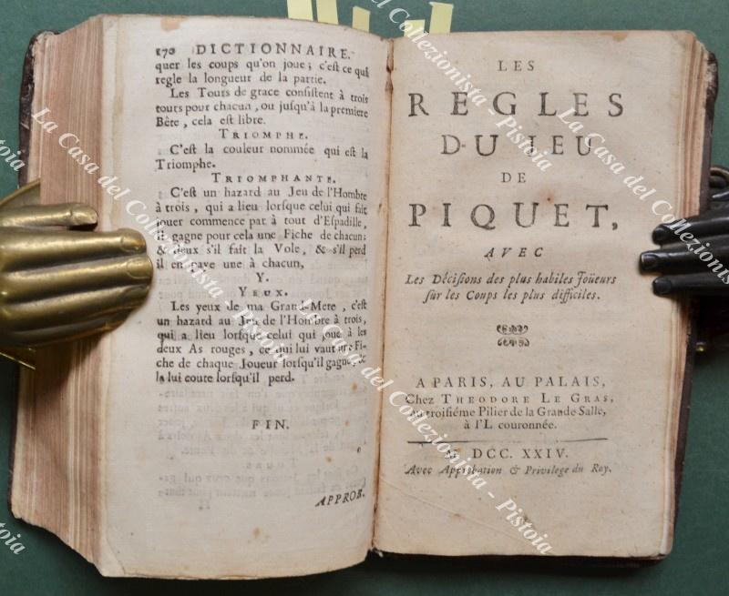 ACADEMIE UNIVERSELLE DES JEUX. Contenant les regles des jeux du Trictrac, des Echecs, du Quadrille, du Quintille, de l'Hombrea trois, du Piquet, du Reversis; & de tout des àutres jeux. AVEC Des Instructions faciles pour apprendre a les bien jouer. Paris, Chez Theodore Legra, 1725