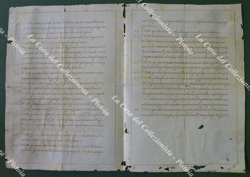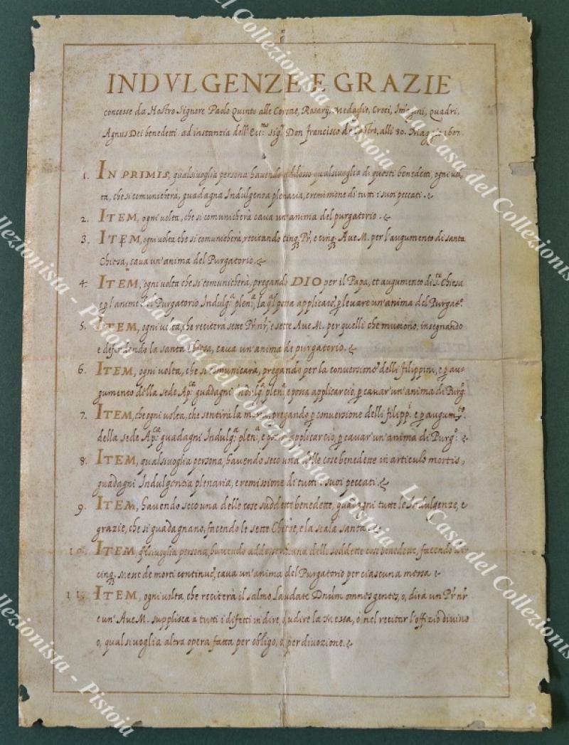 Anno 1607. INDULGENZE E GRAZIE concesse da Nostro Signore Paolo Quinto alle Corone, Rosarii, Medaglie, Croci, Imagini, Quadri, Agnus Dei benedetti ad instanzia dell'ecc.mo sig.r Don Francisco de Castro, alli 30 Maggio 1607. Bifolio in pergamena di cm 21x29. Su tre facciate (la quarta è bianca) manoscritte a china e oro, 28 condizioni che, se osservate, donano al penitente indulgenze e remissioni dei peccati e liberano un'anima dal purgatorio. Mancanze alla pergamena che non ledono la parte scritta. (Rif.F7679)
