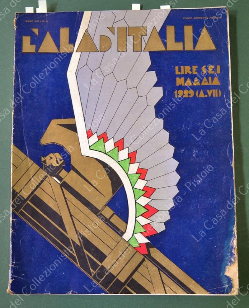 (Aviazione) L'ALA D'ITALIA. Rivista mensile di aeronautica. Roma, anno VIII n.5 maggio 1929. Cm 27x34, brossura editoriale a colori. pagine complessive 102; molte pagine disegnate a colori con pubblicità aeronautiche. Numerosi difetti dovuti all'aderenza delle pagine. (Rif.7672)