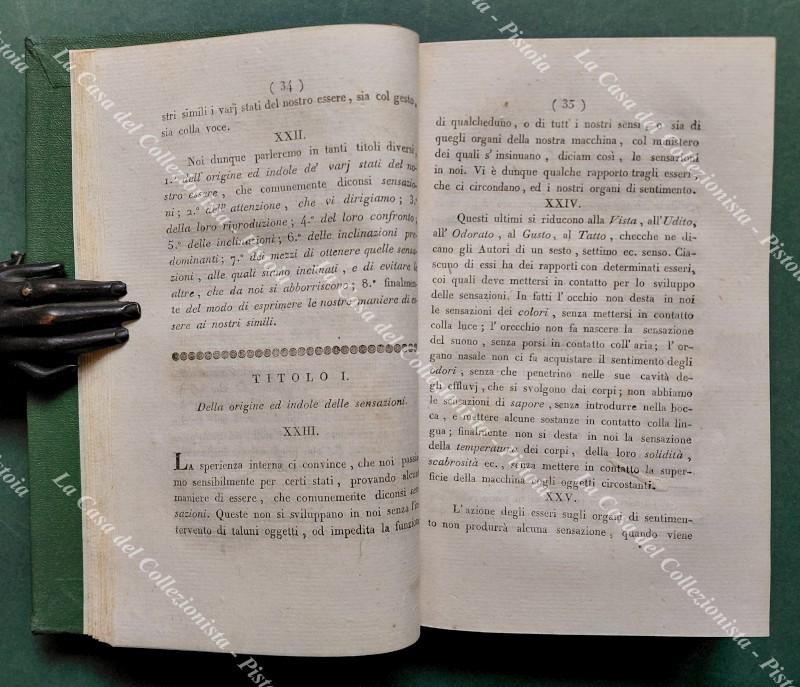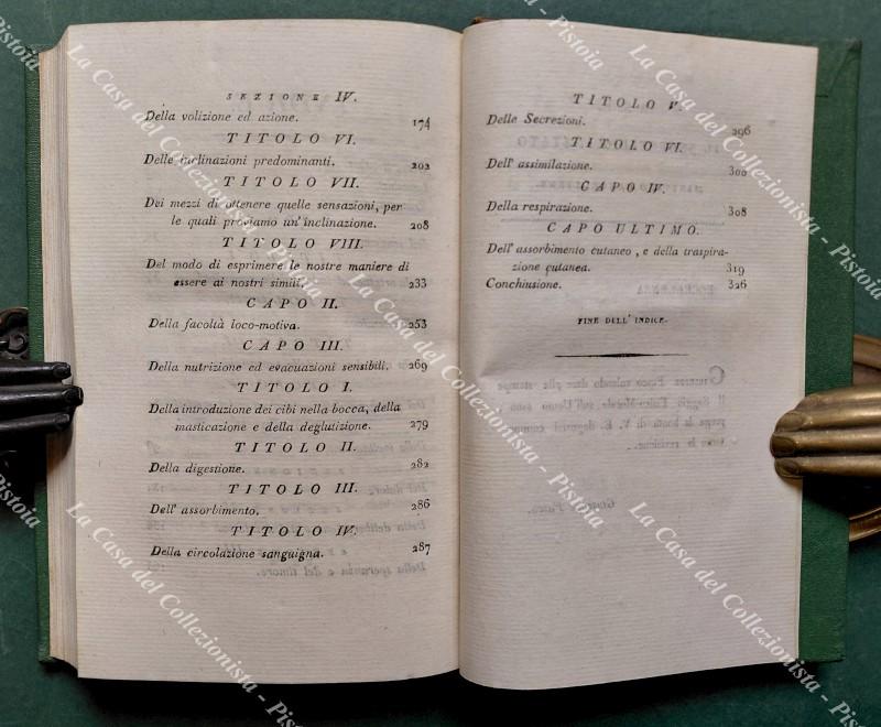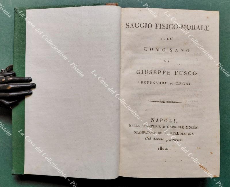 (Fisiologia - Filosofia) FUSCO Giuseppe. SAGGIO FISICO - MORALE SULL'UOMO SANO. Napoli, Stamperia di gabriele Mosino, 1820. Cm 13,5x20,5, bella mezza pelle ottocentesca con titolo in oro al dorso. Pp. 326 + 10 non numerate. Ottima conservazione. (Rif.F7081)