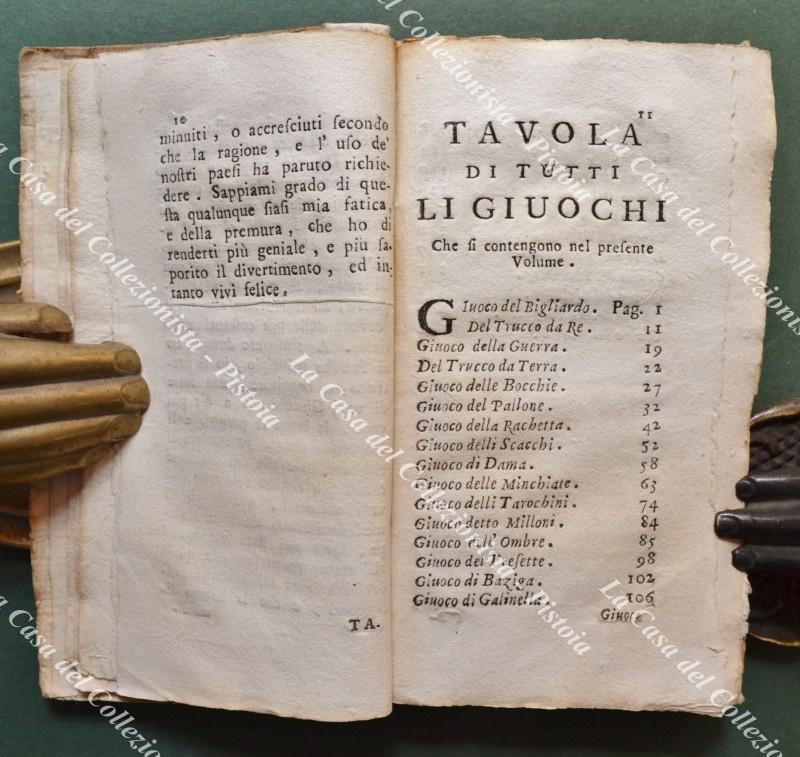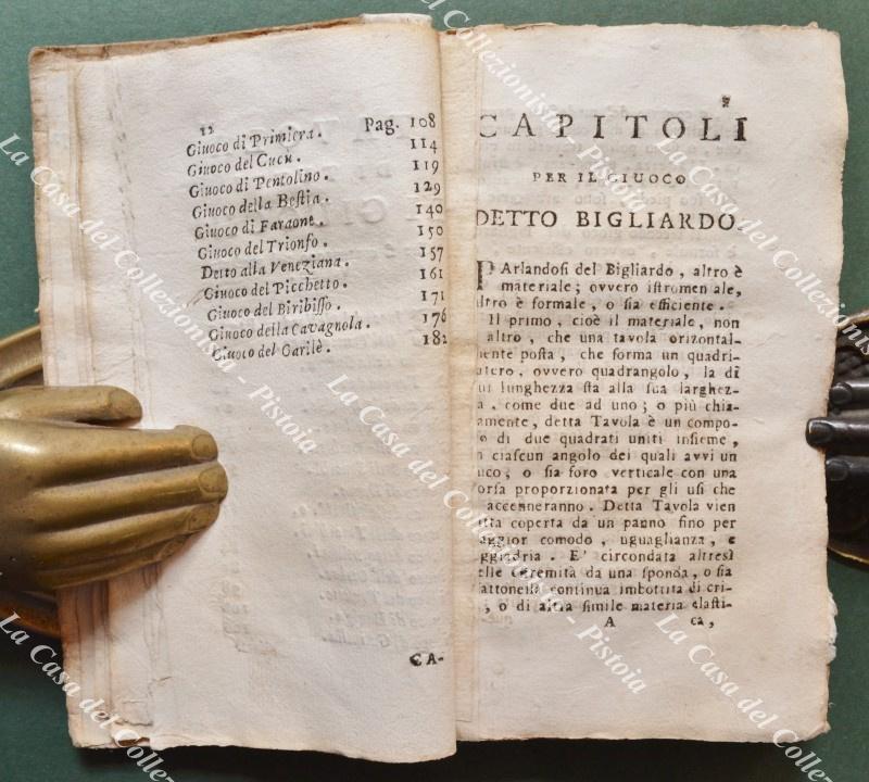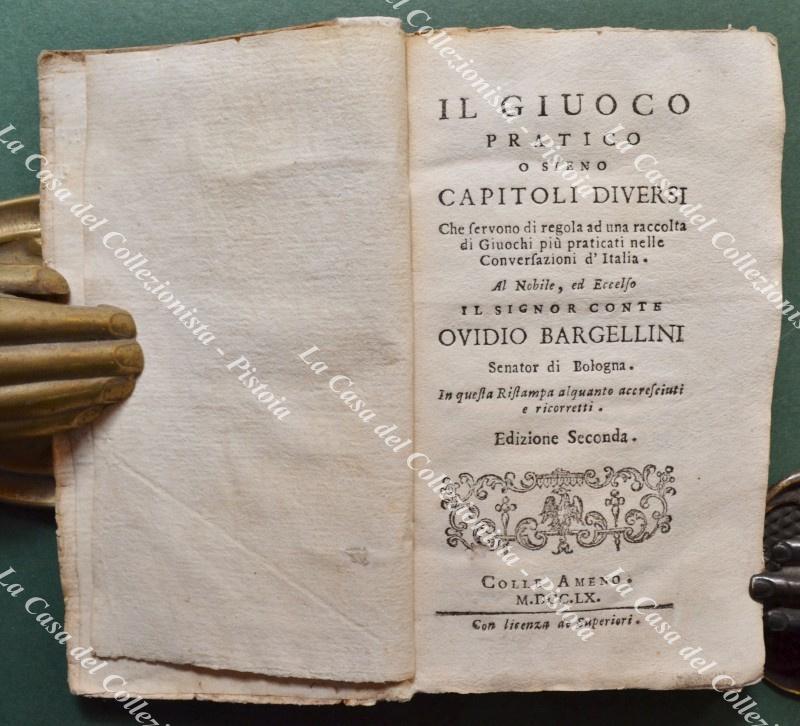(Giochi - ediz. '700) BISTEGHI RAFFAELLO. IL GIUOCO PRATICO o sieno CAPITOLI DIVERSI Che servono di regola ad una raccolta di Giuochi più pratricati nelle Conversazioni d'Italia. Al Nobile, ed Eccelso IL SIGNO CONTE OVIDIO BARGELLINi. In questa Ristampa al quanto accresciuti e ricorretti. Edizione seconda. Colle Ameno, 1760.