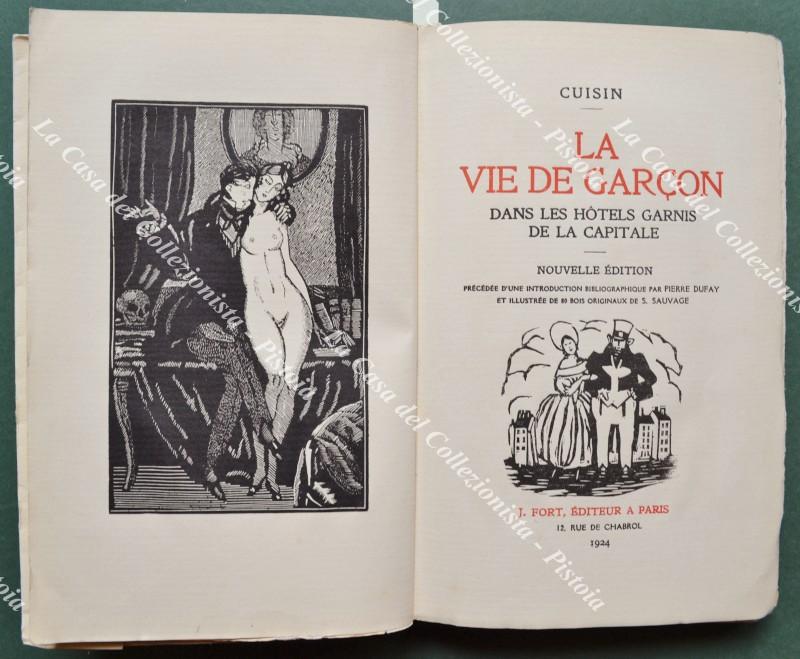 (Letteratura erotica) CUISIN. LA VIE DE GARCON DANS LES HOTELS GARNIS DE LA CAPITALE. Nouvelle edition précédée d'une introduction bibliographique par PIERRE DUFAY et illustrée de 80 bois originaux de S. SAUVAGE. Parigi, J. Fort editeur, 1924. Cm 14x22, brossura editoriale illustrata. Pp. XXXII + 216 con 80 xilografie originali di Sylvain Sauvage di cui 26 fuori testo. Tiratura di 1200 esemplari numerati; il nostro esemplare reca il n. 776 su carta vergata gotica. Buona/ottima conservazione. (Rif.F7651-77)
