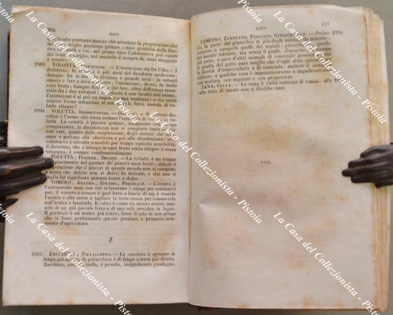 (Lingua italiana) ZECCHINI PIETRO STEFANO. DIZIONARIO dei SINONIMI DELLA LINGUA ITALIANA ... CON L’AGGIUNTA DI MOLTI VOCABOLI oltre quelli esistenti nel Nuovo Dizionario de’ Sinonimi del TOMMASEO edito nel 1838 da G.P.Vieusseux. Torino, Pomba, 1848. In 16° (cm 11x17), mezza pelle coeva con tit. in oro al dorso. Pp. XXXII + 957 + (3). Lievi ingiallimenti diffusi e piccole usure, ma buona conservaz.. (Rif.F6522-76)