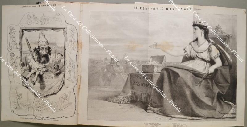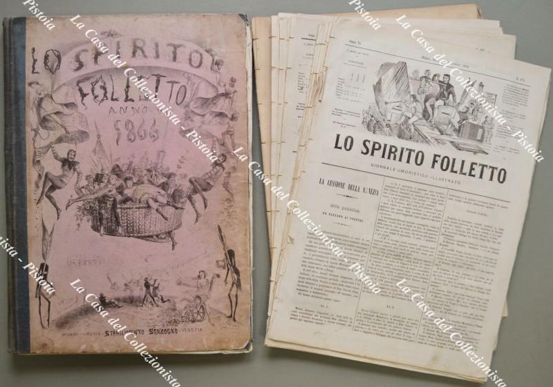 (Periodico satirico ill. '800) LO SPIRITO FOLLETTO. ANNATA 1866. 37 numeri (su 52). Giornale umoristico illustrato. Settimanale (usciva il giovedì) edito a Milano da Sonzogno. In folio (cm 30x43), pp. 8 a numero. Celebre per le splendide illustrazioni in litografia, anche a doppia pagina e presenti in ogni numero, ad opera di Gonin, Teja, Maironi, Gorra, Greppi, Cadolini. Sciolti, provenienti da rilegatura. Qualche accettabile difetto. Sono uniti, della stessa annata, altri numeri scompleti. Quasi sempre assenti sono presenti, per ogni numero, le 4 pagine gialle a stampa che contenevano il giornale.(Rif.F5941-76)