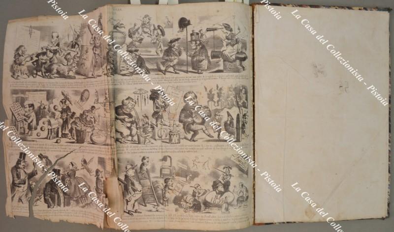 (Periodico satirico ill. ‘800) IL FISCHIETTO. Annata 1858. Completa. Rivista satirica fondata a Torino nel 1848 dal disegnatore Lorenzo Pedrone (Icilio) e dal tipografo Giuseppe Cassone; pubblicata, con differenti periodicità, fino al 1916. Deve il proprio nome al proposito di “fischiare su tutte le cose ingiuste”. E’ considerata la più importante rivista satirica italiana della sua epoca. 155 numeri consecutivi (Dal n. 1 del 2 gennaio al n. 155 del 30 dicembre) di pp. 4 ciascuno, formato cm 27x36. Usciva il martedì, giovedì e sabato. Bellissime illustrazioni di Ridenti in litografia anche ripiegate. Legatura in mz. pelle del tempo con usure e allentata al gioco interno del piatto anteriore. Annata di difficile reperibilità ma con vari difetti: frontespizio staccato e difetti, macchia d'inchiostro con danni ai nn. 70 e 71 e a qualche altra pagina, mancanza di 2 pagine al n. 91, vari strappi e spiegazzature. (Rif.F6702-76)