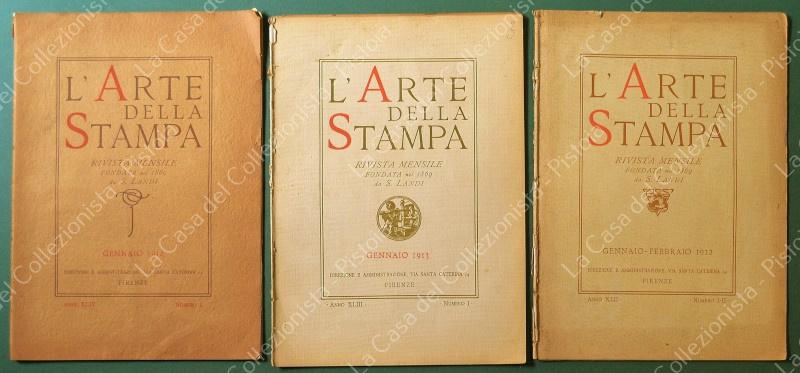 (Stampa) L'ARTE DELLA STAMPA. Rivista mensile fondata e diretta per 42 anni da Salvatore Landi studioso di problemi tecnici della stampa. Formato cm 24,5x33,5, pagine 12 di testo + pagine pubblicitarie e 1 tavola fuori testo per ogni numero. Disponiamo: numeri 1/2 Gennaio - Febbraio 1912, numero 1 Gennaio 1913, numero 1 Gennaio 1914. Qualche usura, ma accettabile conservazione. (Rif.F7677)