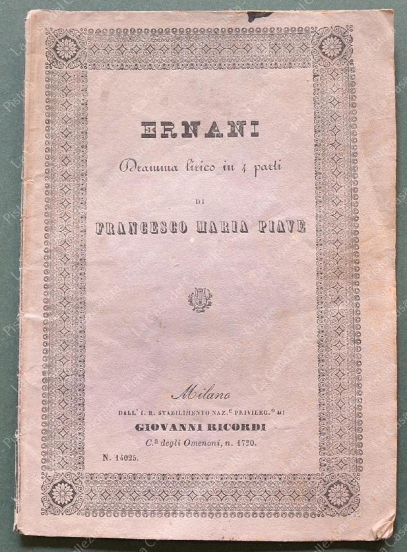 (Teatro) ERNANI. Dramma lirico in quattro parti di Francesco Maria Piave posto in musica da Giuseppe Verdi. Milano,Giovanni Ricordi, 1845. Cm 11,5x16,5, brossura originale tipografica, pagine 36. Ingiallimenti e lievi difetti. Raro. (Rif.F6766)