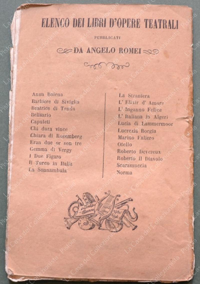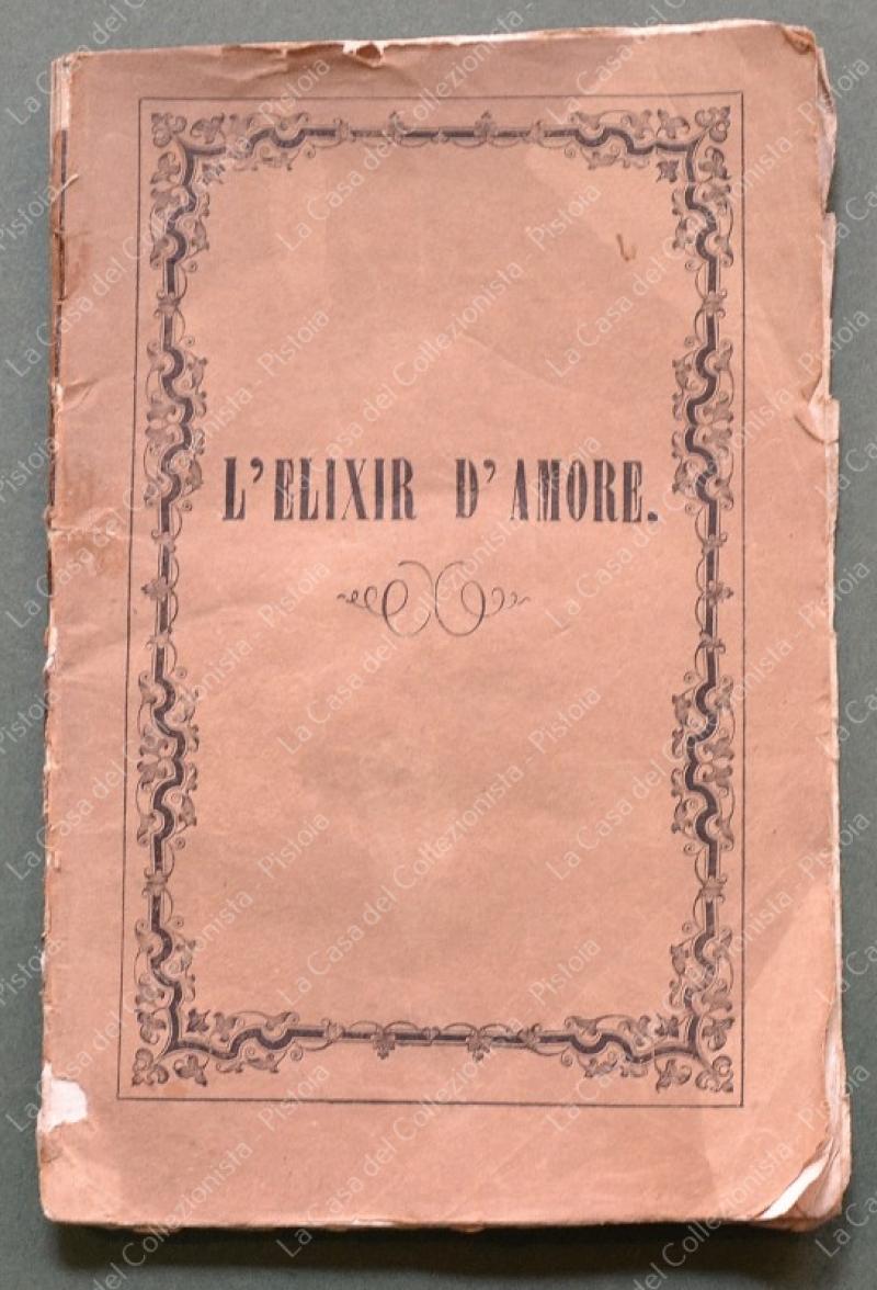 (Teatro) L'ELIXIR D'AMORE. Melodramma giocoso in due atti. Poesia del cavalieri Felice Romani. Musica del maestro Gaetano Donizzetti. Firenze, presso Angelo Romei, 1857. Cm 11x17, brossura editoriale, pagine 36. Lievi usure per lo più al dorso. (Rif.F6762)