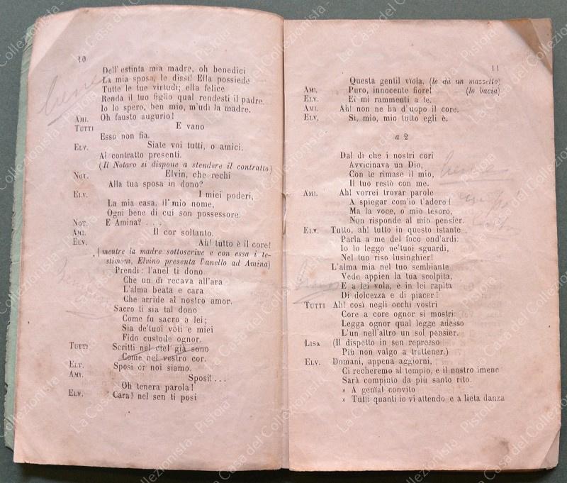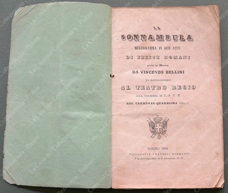(Teatro) LA SONNAMBULA. Melodramma in due atti di Felice Romani. Posto in musica da Vincenzo Bellini. Da rappresentarsi al Teatro Regio nel Carneval - Quaresima 1856 - 57. Torino, F.lli Fodratti, 1856. Cm 10,5x17, brossura originale tipografica, pagine 35 + 1 bianca. Varie annotazioni a matita. Varie accettabili usure. (Rif.F6759)