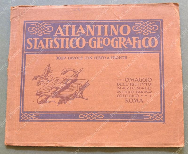 Atlante. ATLANTINO STATISTICO - GEOGRAFICO XXIV TAVOLE A COLORI CON TESTO. Omaggio dell'Istituto Nazionale Medico Farmacologico di Roma. Bergamo, Ist. It. Arti Grafiche, 1922. Cm 20x17, brossura editoriale illustrata. Ottima conservazione. (Rif.F8172)
