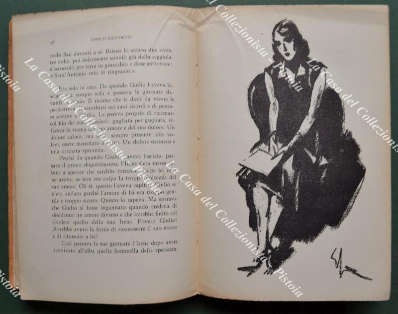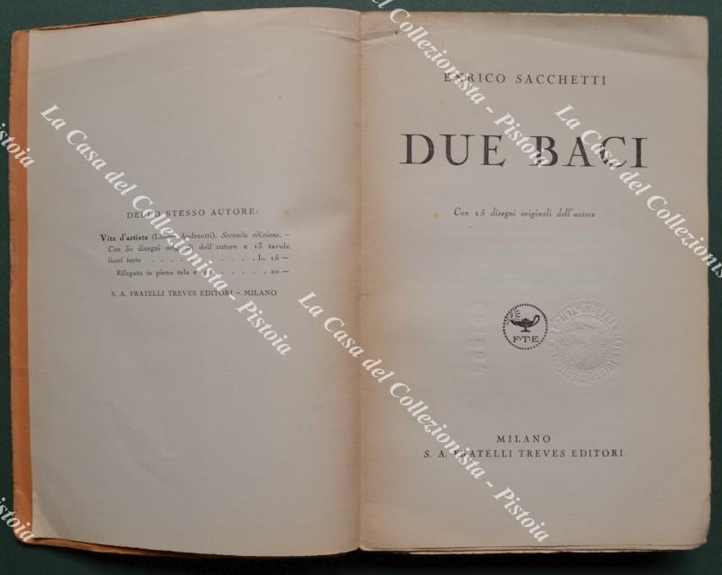 (Letteratura) SACCHETTI Enrico. DUE BACI. Con 15 disegni originali dell'autore. Milano, Treves, 1936 (prima edizione). Cm 15x22, brossura editoriale (mende al dorso), pp. 248 + (4). Esemplare intonso. (Rif.F7509-77)