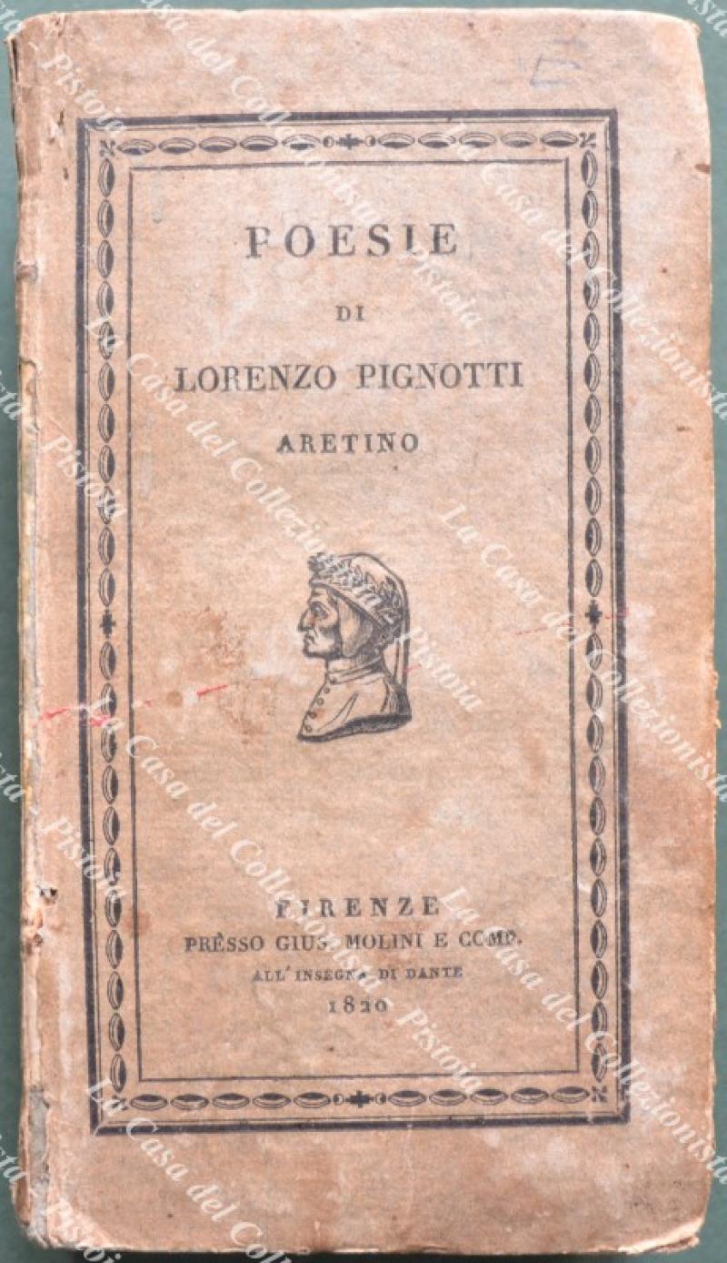 (Poesia - ediz. ‘800) PIGNOTTI LORENZO. POESIE DI PIGNOTTI LORENZO ARETINO. Firenze, Giuseppe Molini, 1820. Cm 8x14,6. Legatura coeva editoriale in cartone rigido (usure alle cerniere per il resto buona). Due tavole f.t. incise da Lasinio, pp. (6) + 733 + (3). Interno assai buono. (Rif.F0785-74)