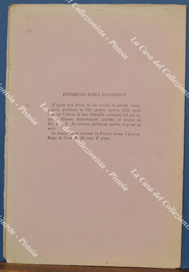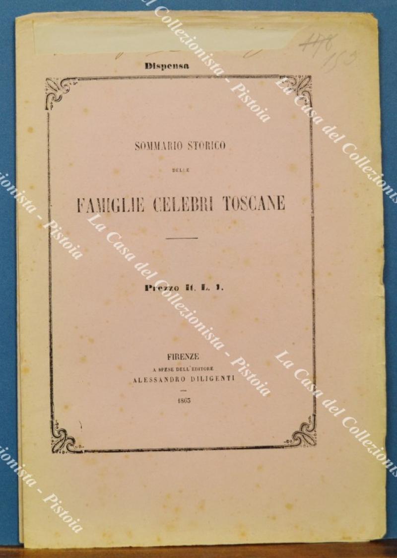 (Araldica - Toscana) Famiglia CARDUCCI di FIRENZE. Fascicolo completo di cm 19,5x28,5: brossura editoriale contenente tavola colorata all'epoca a mano e 3 pagine di testo relative alla storia della famiglia. Il fascicolo è tratto dall'opera SOMMARIO STORICO DELLE FAMIGLIE CELEBRI TOSCANE di Tiribilli Giuliani - Luigi Passerini edita tra il 1862 ed il 1865 a Firenze da Alessandro Diligenti. Buona conservazione. (Rif.F7568)