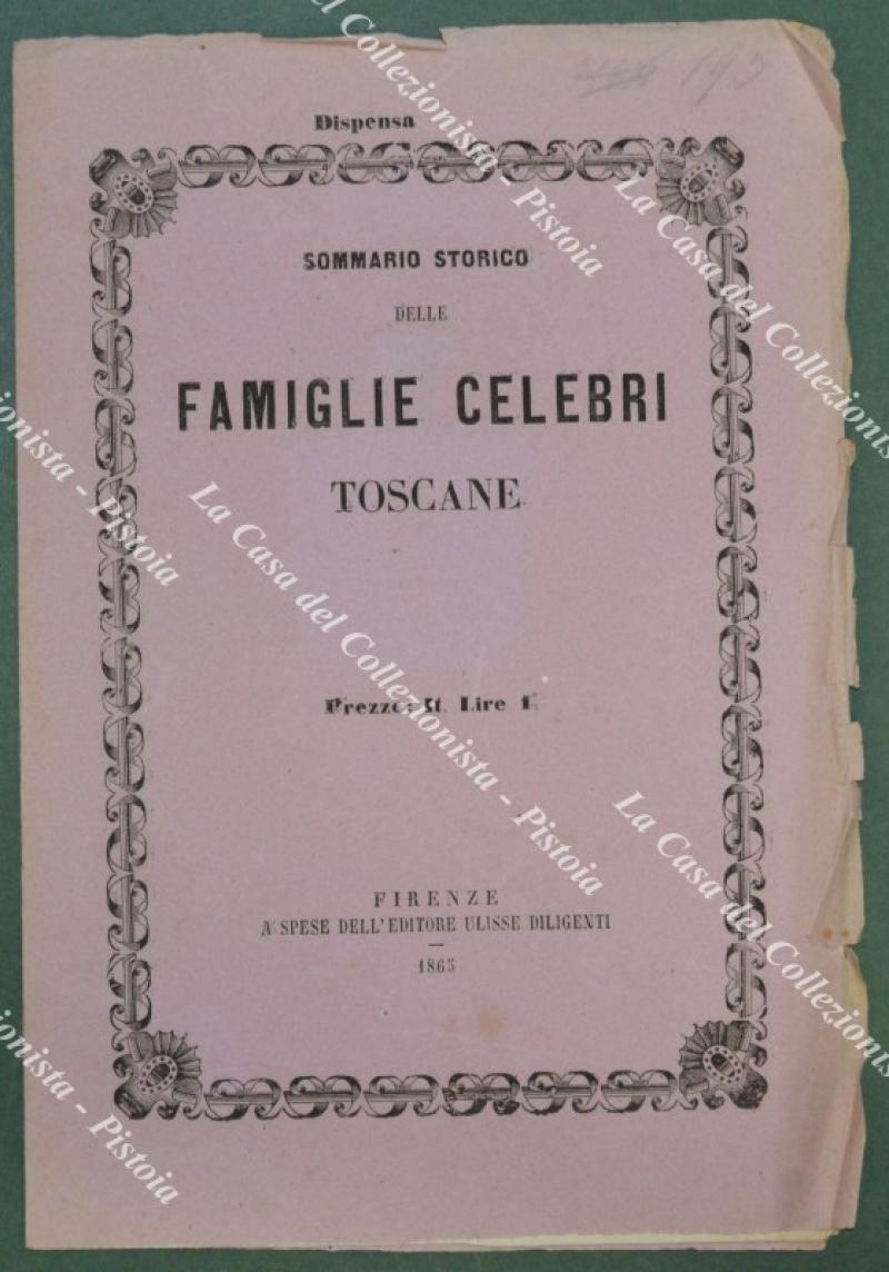 (Araldica - Toscana) Famiglia CENAMI di Lucca. Fascicolo completo di cm 19,5x28,5: brossura editoriale contenente tavola colorata all'epoca a mano e 4 pagine di testo relative alla storia della famiglia. Il fascicolo è tratto dall'opera SOMMARIO STORICO DELLE FAMIGLIE CELEBRI TOSCANE di Tiribilli Giuliani - Luigi Passerini edita tra il 1862 ed il 1864 a Firenze da Alessandro Diligenti. Buona conservazione. (Rif.F7562)