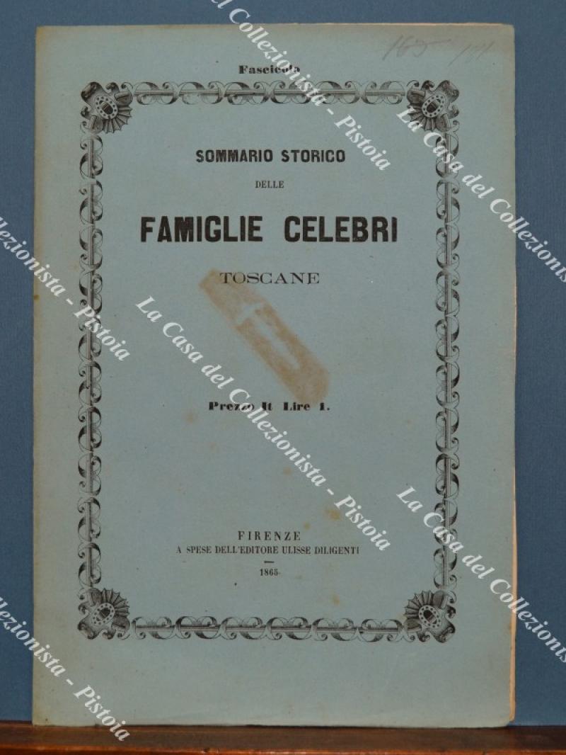 (Araldica - Toscana) Famiglia FINETTI di Siena. Fascicolo completo di cm 19,5x28,5: brossura editoriale contenente tavola colorata all'epoca a mano e 3 pagine di testo relative alla storia della famiglia. Il fascicolo è tratto dall'opera SOMMARIO STORICO DELLE FAMIGLIE CELEBRI TOSCANE di Tiribilli Giuliani - Luigi Passerini edita tra il 1862 ed il 1865 a Firenze da Alessandro Diligenti. Buona conservazione. (Rif.F7564)