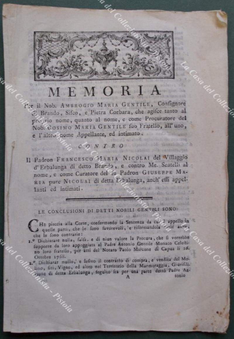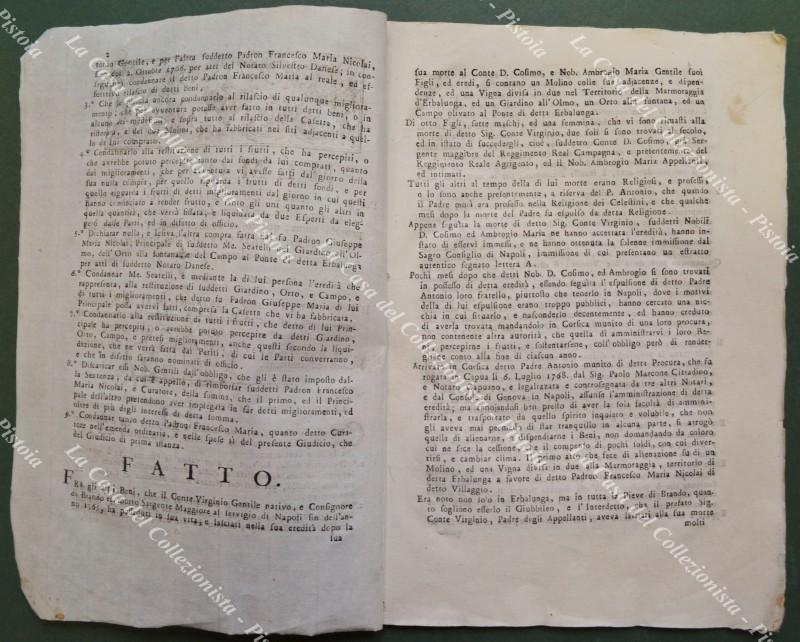 Corsica, anno 1779. MEMORIA legale per una disputa per la cessione di un mulino, fabbricati annessi ed una vigna nel territorio di Erbalunga.