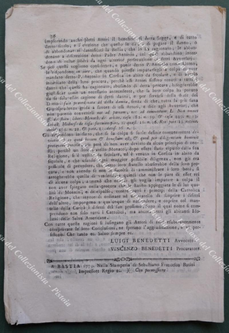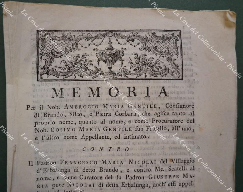 Corsica, anno 1779. MEMORIA legale per una disputa per la cessione di un mulino, fabbricati annessi ed una vigna nel territorio di Erbalunga. 32 pagine di cm 21x30, Bastia anno 1779. Testatina incisa. (Rif.F7054)